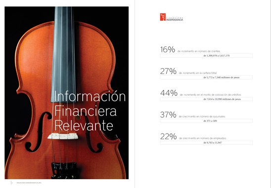 El informe anual de Financiera Independencia 2011 se basa en la expresión del concepto "Diversidad", mediante una analogía de conceptos musicales: diversidad, balance, contrapunto, orquestación, dirección, instrumentos... con respecto a la diversificación de la empresa en variedad de productos, modelos de negocio, cobertura geográfica, sectores de atención, tipos de créditos y clientes.